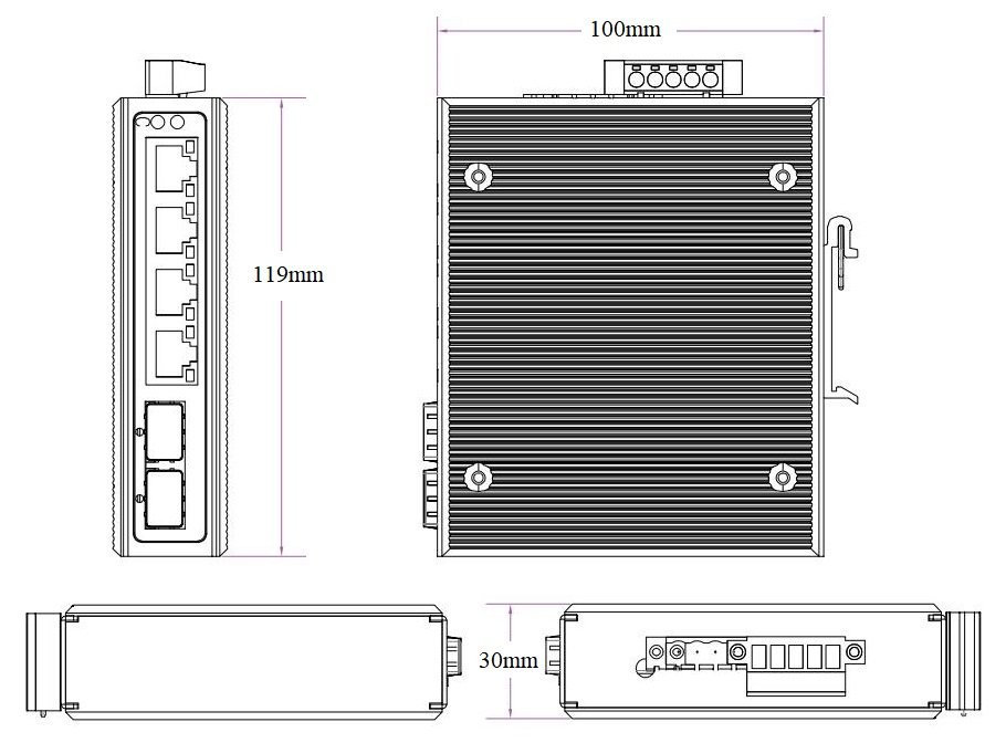 2*1000Base-X uplink SFP fiber ports (Data) 4*10/100/1000Base-T PoE ports (Data/ Power) 2 set V+, V- redundant DC power port (5Pin Phoenix terminal) |