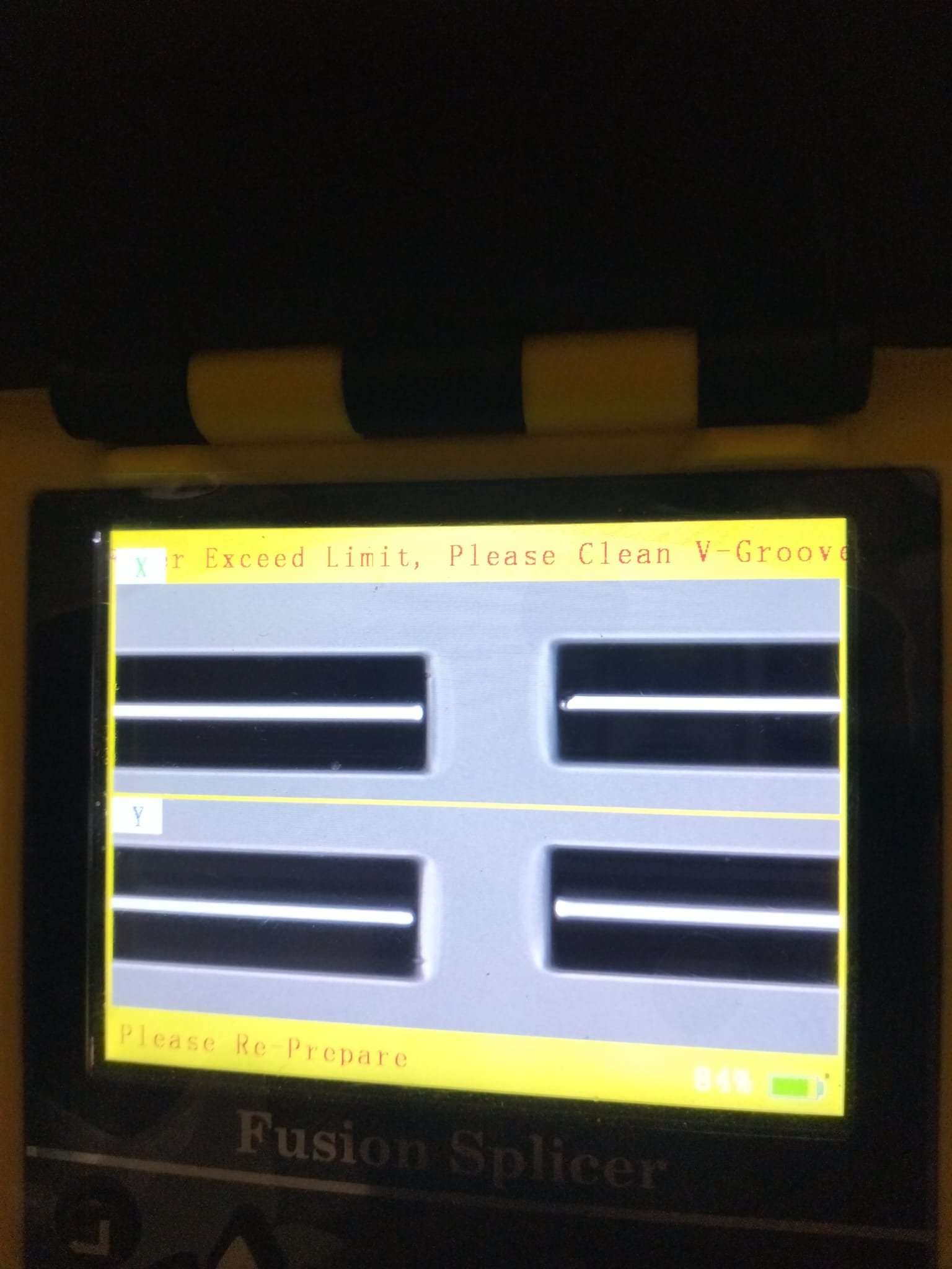Una de las fallas comunes en el proceso de fusión es la suciedad acomulada de los conductos V-Groove de todas las fusionadoras. Las causas mas comunes cuando se trabaja en campo es la contaminación, lluvia, cortes de fibra limpiados a mano o la fata de una herramienta adecuada que deje residuos que impiden el correcto deslizamiento de la fibra por los canales V-Groove. Los canales V-GROOVE se pueden identificar en la mayoria de los modelos por su color azul y porque son los encargados de conducir el alineamiento de la fibra empujada por los motores de fusión hasta el punto de fusión de los electrodos. Esos canales deberán estar limpios en todo momento y no ofrecer resistencia al desplazamiento de la fibra durante el proceso de fusión. Si en tu fusinadora aparece el Error Exceed Limit , Please Clean V-Groove, deberás auxiliarte de la brocha de limpieza y de la botella de aire seco manual para limpiar con suavidad el canal. Podrás auxiliarte también de un bastoncito con alcohol para limpiar el canal desde los electrodos hacia la parte contraria , nunca tocando los electrodos. En todo momento con la fusionadora apagada o sin bateria para evitar tocar nada durante el proceso con la fusionadora en marcha.